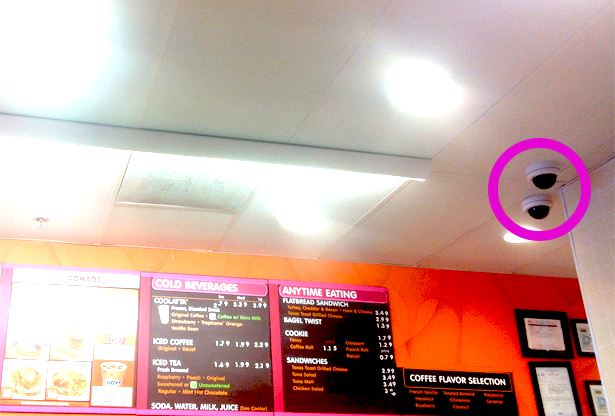 Surveillance cameras in a Dunkin Donuts are highlighted in pink. Image: Megan Garber.